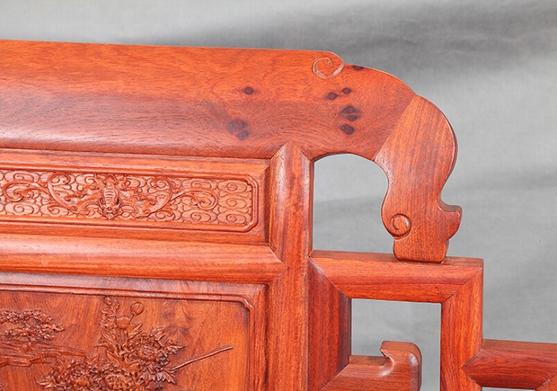 整體上,該款沙發(fā)背板處的設(shè)計有別于我們福林堂紅木客廳沙發(fā)系列里面的其他沙發(fā),所留余鏤空面積較多,主要位于正中背板處的左右兩側(cè)的上下各處部位,鏤空形狀匡正簡致,整齊有一,左右對稱,極具觀賞美。另在其鏤空的中間位置處,還特別雕繪有一精美的草龍紋飾。