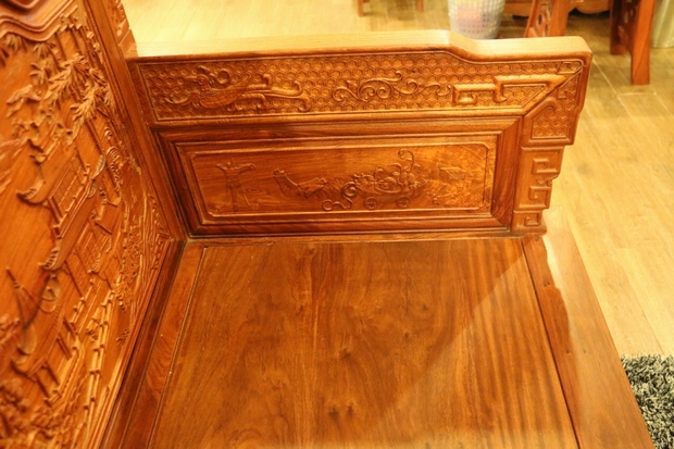 沙發(fā)的座椅面平整光滑,極盡原木材質(zhì)紋理之視覺(jué)感受;側(cè)面扶手處無(wú)任何鏤空面積之留飾,嚴(yán)實(shí)而框整,整體框架為矩形外觀(guān)設(shè)計(jì)。扶手上端正反兩面位置處,同樣雕繪有上處靠背板處鳳凰圖案形狀之紋飾,扶手底部正反兩面位置則雕繪有一些商周時(shí)期使用的器具,如斟酒器、編鐘等。