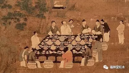 上圖是一些雅士的聚會,我們可以看到中國古代是分餐制的,大家圍到一起,在一個很大的“榻”四周。這個榻,我們仔細觀察可以發(fā)現(xiàn)它原本是“箱型”形制的。