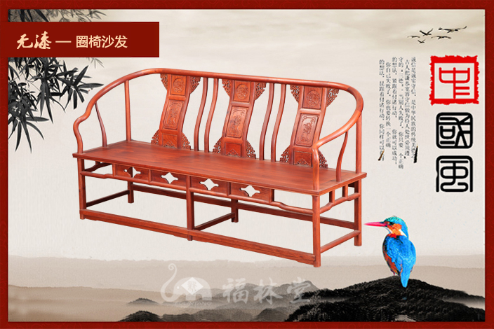 圈椅,因椅圈恰似羅圈,民間又稱“羅圈椅”或“圓椅”,圈椅的造型上圓下方,外圓內(nèi)方,這暗和了中國傳統(tǒng)文化中的乾坤之說,乾為天為圓,坤為地為方,而外圓內(nèi)方則是中國傳統(tǒng)文化中所崇尚的一種品德,雖在處事上有所圓滑但卻內(nèi)在有所堅(jiān)持。它最明顯的特征則是在圈背上連結(jié)著扶手,從高到低一順而下,座靠時可使人的臂膀都倚著圈形的扶手,感到十分舒適,頗受人們喜愛!