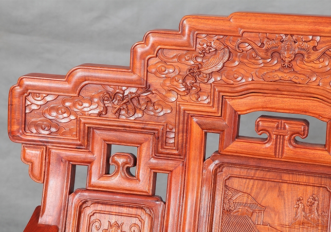 最后,來說說背靠板最上端部分的那綿延浮縷、緊密嚴(yán)挨著的充斥于其間的祥云云海紋飾。該處圖案可以說是整體沙發(fā)圖案中最為驚艷也是最為惹眼的一處了,在這其中也還另在正中位置處雕繪有寄寓幸福之意的蝙蝠紋;以及下方銜掛有的“磬”紋(磬——它是中國古代宮廷的打擊樂器,形有大有小,上方刻有花紋,并鉆孔懸掛于架下,用以擊打傳聲,其聲響通透清亮極為悅耳);左右兩側(cè)板面另還雕飾有幾處寄寓福壽平安之意的道八寶紋飾,從左往右分別是魚骨、羽扇、寶葫以及玉板四處。整處圖案雕飾于呈階梯式層層遞進(jìn)延伸之外輪廓,銜駕于最上端背板之上,在呈現(xiàn)美好寄寓的同時也同樣有著寶座威嚴(yán)、尊貴之氣勢,也更適合擺放在平常家中使用。