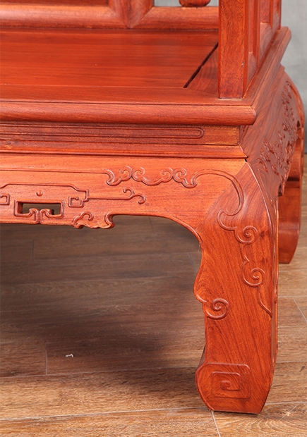 整體上,該款沙發(fā)背板處的設(shè)計有別于我們福林堂紅木客廳沙發(fā)系列里面的其他沙發(fā),所留余鏤空面積較多,主要位于正中背板處的左右兩側(cè)的上下各處部位,鏤空形狀匡正簡致,整齊有一,左右對稱,極具觀賞美。另在其鏤空的中間位置處,還特別雕繪有一精美的草龍紋飾。